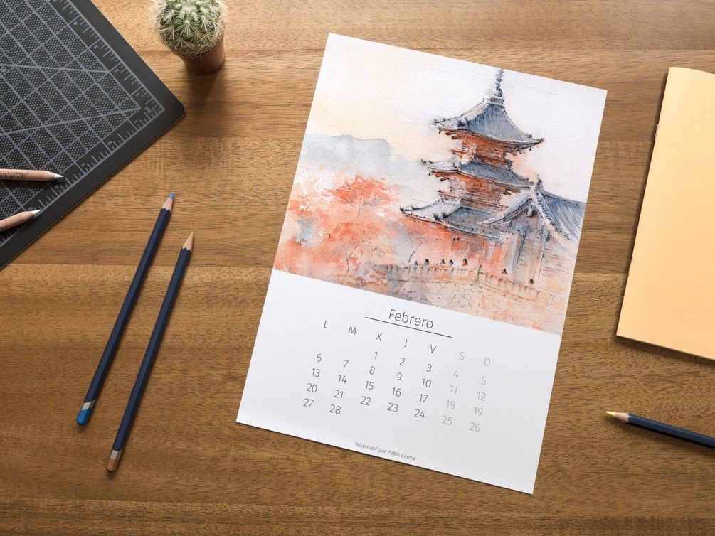 There is a 2023 calendar one click away, including watercolors by artist Pablo Cuesta. You will download a series of JPG files, one per month in both Spanish and English, that you can print (A4 format (21x29,7 cm)). I recommend at least 180 g/m2 matte paper.